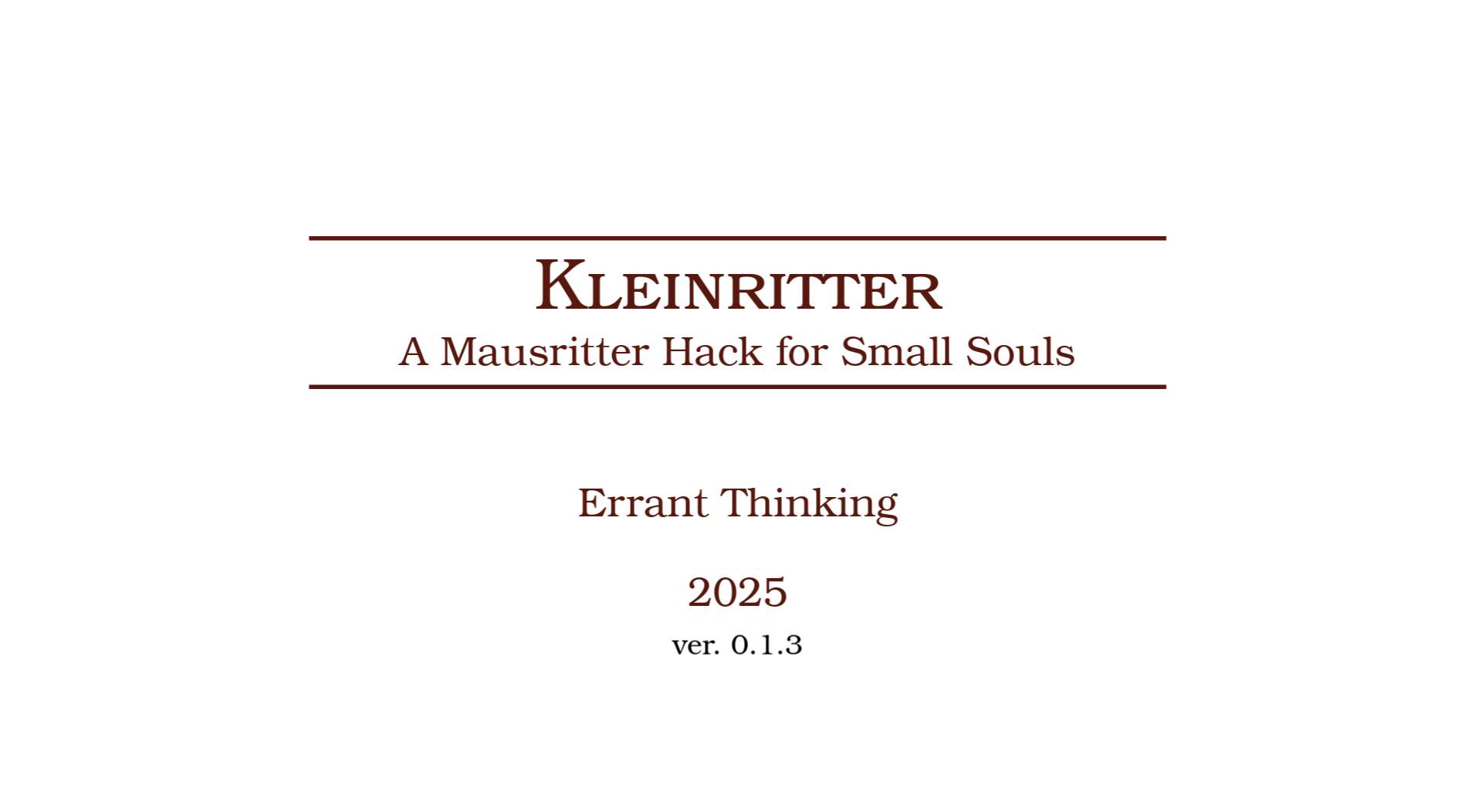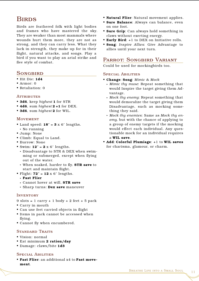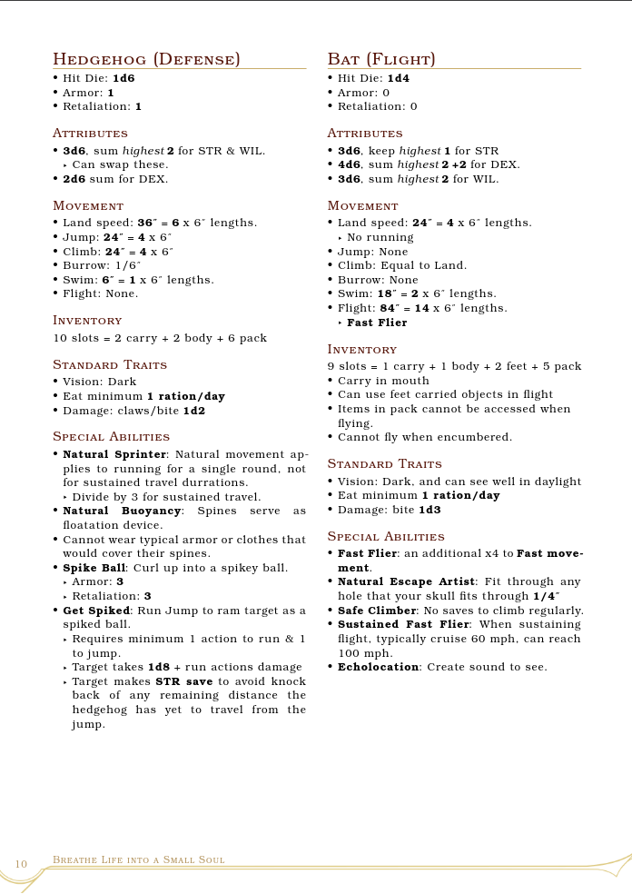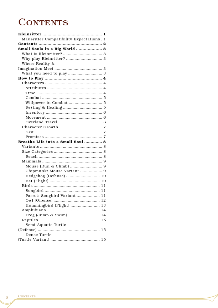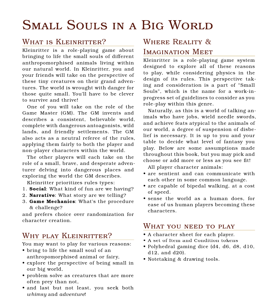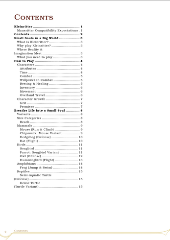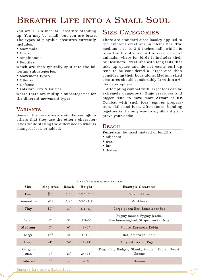 This is an ashcan hack of Mausritter and v0.1.3 of the very early beginnings of my personal TTRPG project "Small Souls". Play as 3 to 6 inch tall anthropomorphic creatures going on grand adventures.